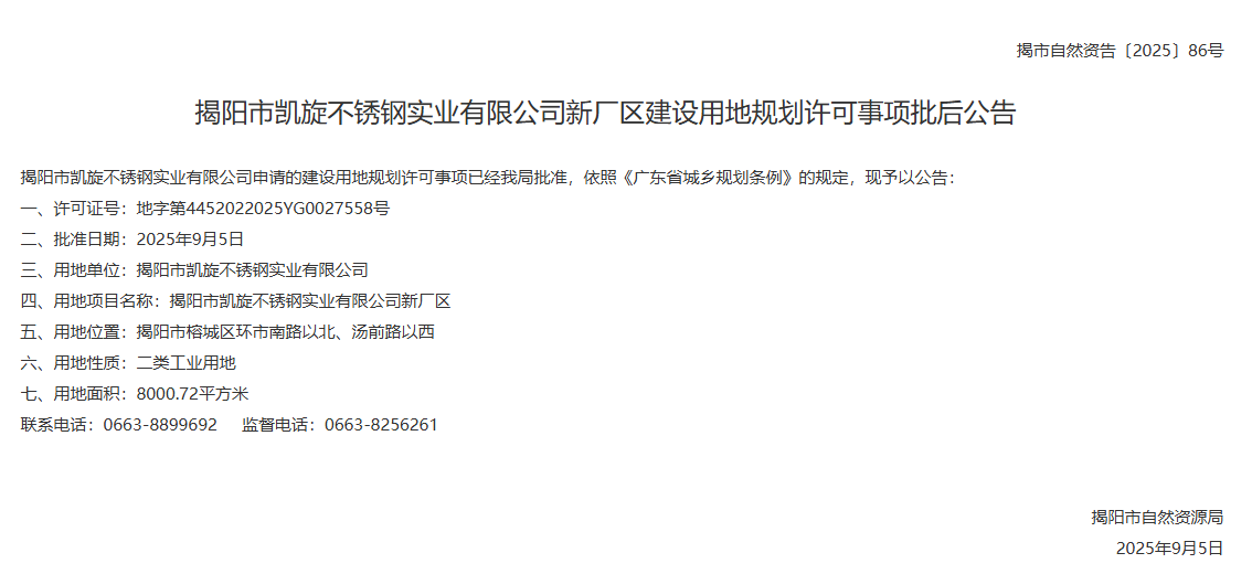 2025年9月5日,揭陽市凱旋不銹鋼實業(yè)有限公司新廠區(qū)建設(shè)用地規(guī)劃許可事項批后公告。(來源:揭陽市自然資源局)聲明:以上內(nèi)容轉(zhuǎn)載自51不銹鋼網(wǎng),如有侵權(quán)請告知刪除。
